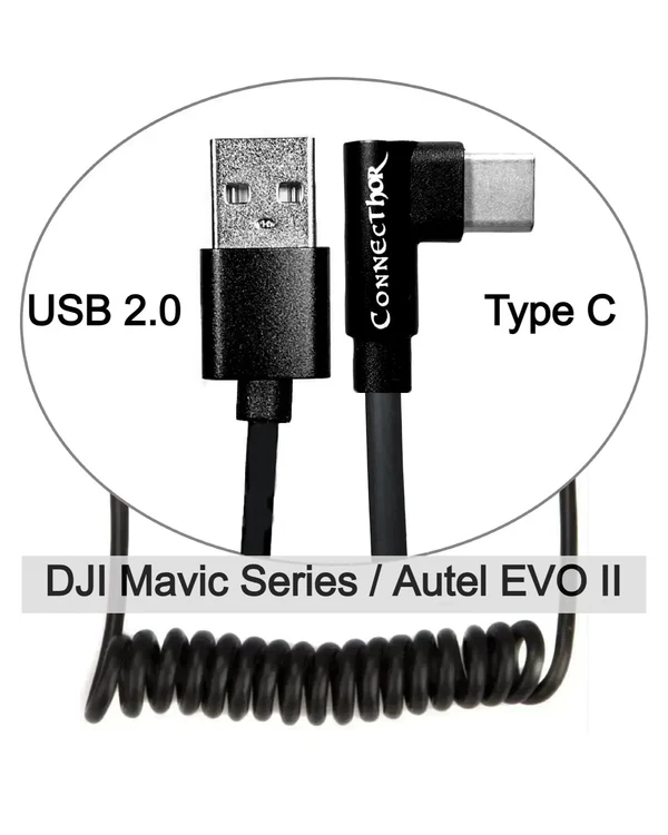 Kabel ConnecThor USB 2.0 (prosty) – Type-C (kątowy) zwinięty na sprężynie, długość 30-60 cm (EAN_7090045910177) od Thor’s Drone World